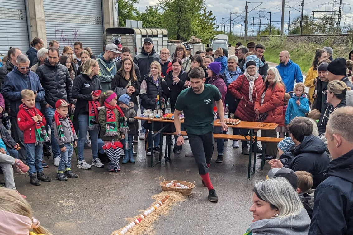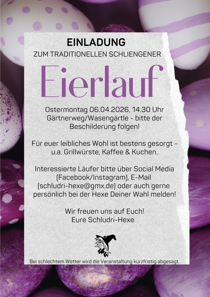 Der Eierlauf am Ostermontag hat in Schliengen eine jahrzehntelange Tradition, die fast in der Versenkung verschwunden wäre. Bauvorhaben und die Corona Pandemie sorgten dafür, dass von 2019 bis 2024 kein Eierlauf stattfinden konnte. „Schade“, fand die Fasnachtsclique der „Schludri-Hexe“ – eine seit 2005 bestehende starke Frauentruppe mit 35 Mitgliedern – und ließ die liebgewonnene Traditionsveranstaltung am Ostermontag 2025 mit neuer Route und anderem Standort wieder aufleben. Manja Fräulin, die Erste Vorsitzende der „Schludri-Hexe“, Saskia Killmer und Katharina Hupfer sind gemeinsam mit ihren Vereinskolleginnen, Unterstützern und Sponsoren froh, im Jahr 2025 den Traditionsbrauch wieder zum Leben erweckt zu haben. Die Resonanz war sehr positiv. Über 200 Personen kamen. Für 2026 hoffen die „Schludri-Hexe“ auf gutes Wetter und viele Gäste. Besonders auch Kinder sind herzlich willkommen.