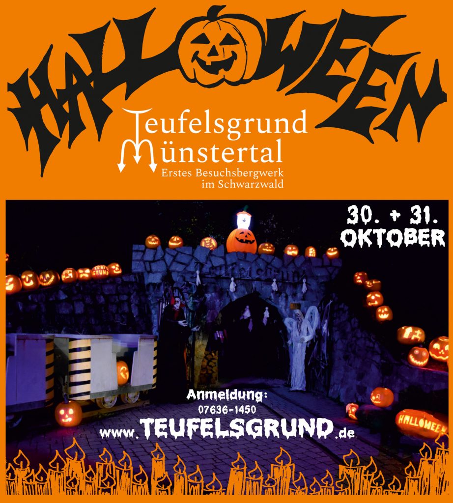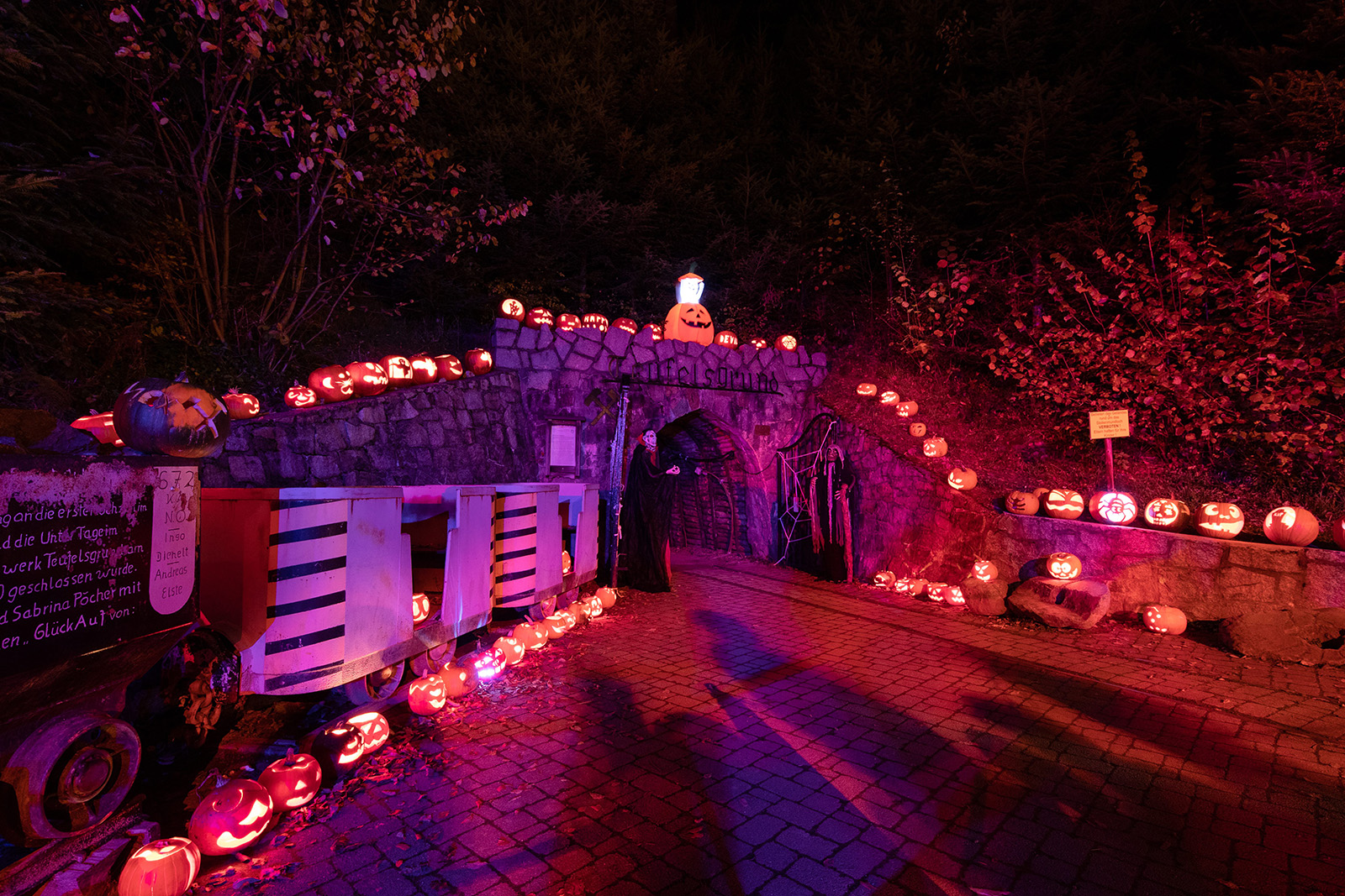 Aber nicht nur im Stollen sind die gruseligen Kreaturen unterwegs, auch vor dem Stollen findet sich das ein oder andere Gespenst. Trotz alledem ist die Veranstaltung als Familienevent ausgelegt, denn wer sich nicht in den Stollen traut, kann sich auf dem ganzen Gelände die unzählig geschnitzten Kürbisse anschauen, sich wundergruselig schminken lassen und sich am Monstergrill und bei Gruselgesöff stärken. Mutige Besucher können sich am DO, 30.10., und FR, 31.10., jeweils ab 13.00 Uhr bis 22.00 Uhr einen Platz für die Gruseltour sichern. Diese finden in regelmäßigen Abständen statt. Eine Anmeldung ist unbedingt erforderlich unter Tel. 07636/1450. Der Gruselchef empfiehlt ein Alter von mindestens 7 Jahren. Für erwachsene Halloweenfans startet am 31.10., um 18.00 Uhr die Gruseltour mit einem passenden Film auf Großbildleinwand (FSK 18).