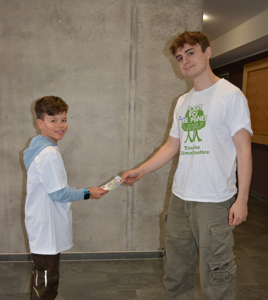 Simon aus Eimeldingen, der bei der Veranstaltung in Laufen dabei war, gefällt Plant-for-the-Planet und er spendete 20 EUR von seinem Taschengeld für die Aktion. Tobias Schlechter nahm das Geld dankbar entgegen.